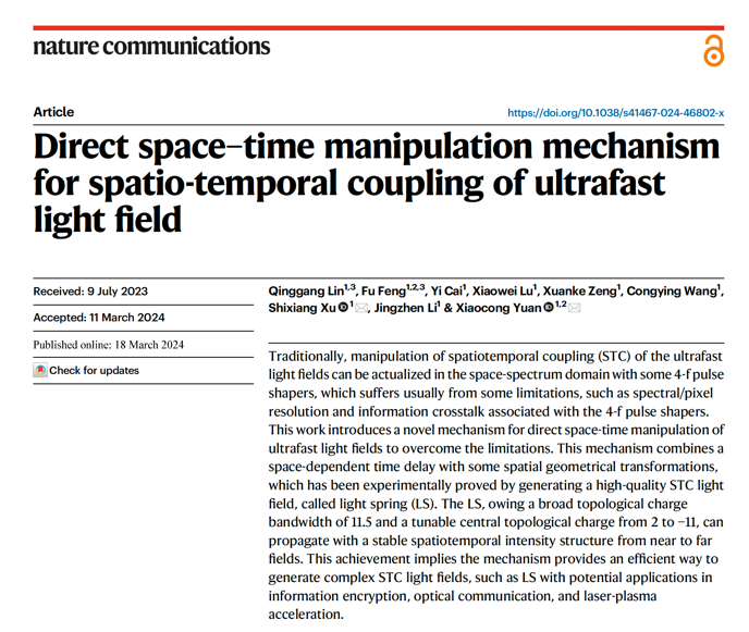 由于光场超快的时间特性,利用光学调制对光场进行直接的时空调控是几乎不可能的。于是,传统调控方法利用超快光场的宽光谱特性以及光场的时域与频域间内在物理关联,通过频域调控结合时-频变换的方法对超快光场进行时空复合调控。其典型的设计是基于光栅对+4 f成像系统,通过在其谱面施加振幅/相位调制获取不同的时空耦合光场。然而这种手段存在光谱分辨低、衍射色散效应、调控延时小等一系列的缺陷。为此,研究团队提出了一种针对超快光场时空耦合调控的新机制:通过引入空间相关的时间延迟结合二维空间几何变化直接实现光场的时空调控。为证实新机制的有效性,团队进一步设计了实现这种机制的技术方案。通过该方案,实验上获得了振幅/相位同时具有涡旋分布的时空耦合光场(简称为光弹簧)。这种光弹簧十年以前就在理论上提出了,但迄今未见实验报道。它在频率域具有宽带光谱拓扑荷,而在时域则具有常数的拓扑荷。这些特性使得它在激光等离子动力学、信息编码、激光驱动电子加速、涡旋太赫兹脉冲产生等方面具有诱人的应用前景。未来,基于这种调控机制,通过调控空间相关的时间延迟和二维空间几何组合就可以得到不同时空耦合的超快光场。相关成果发表在Nature Communications上,深圳大学林庆刚博士、之江实验室冯甫博士为共同第一作者,徐世祥教授、袁小聪教授为共同通讯作者,深圳大学为第一完成单位。