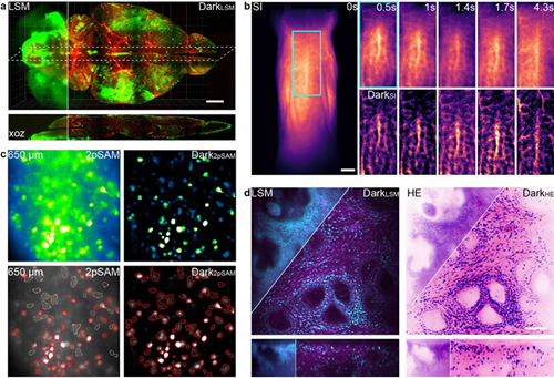 图3. Dark sectioning的典型应用。(a)基于光片的小鼠全脑成像,(b)小鼠血管的小动物活体成像,(c)合成孔径双光子小鼠神经元成像,(d)前列腺组织三维光片成像与虚拟染色图像。比例尺:(a)40 μm,(b)2 mm,(c)32 μm,(d)8 μm。