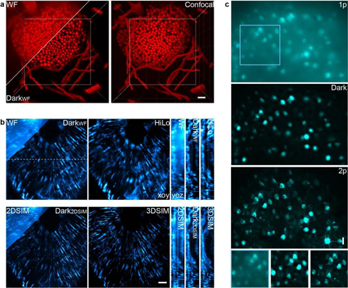 图2. 交叉验证证明Dark sectioning技术的保真性能。(a)霉菌样本的宽场-共聚焦成像,(b)小鼠肾脏微丝的多模态结构光照明显微成像,(c)小鼠神经元钙成像的单光子-双光子成像。比例尺:(a, b)4 μm。