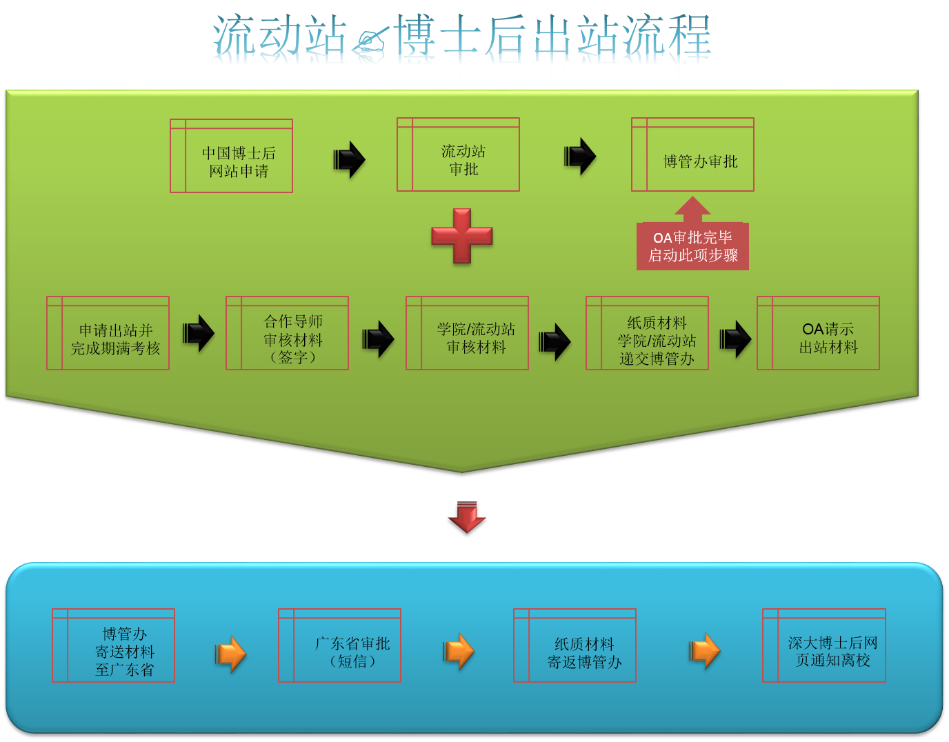 由流动站或学院向校博士后管理办公室提交申报材料,再由博士后管理办公室负责将校领导批准出站的申请人向广东省人社厅报批,广东省人社厅批准通过后,博士后管理办公室将通知博士后。(中国博士后网可查询本人审核状态)。