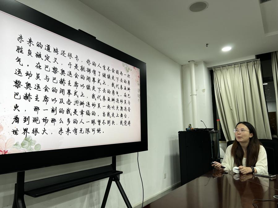 赵冰向大家分享了国乒队员孙颖莎在香港都会大学演讲的演讲稿。演讲稿中提到孙颖莎如何看待失败,如何看待个人理想和国家前途。运动员的奋力拼搏和心路历程引发了赵冰同学的强烈共鸣,对此她表示,我们正处于充满活力与梦想的青春时代,也幸运地生活在充满希望与机遇的美好时代。梦想不会发光,发光的是追光逐梦的青年人,让我们用脚步丈量梦想,用奋斗诠释青春;让我们用五彩斑斓的微光点亮伟大祖国,让梦想在国旗下闪光。
