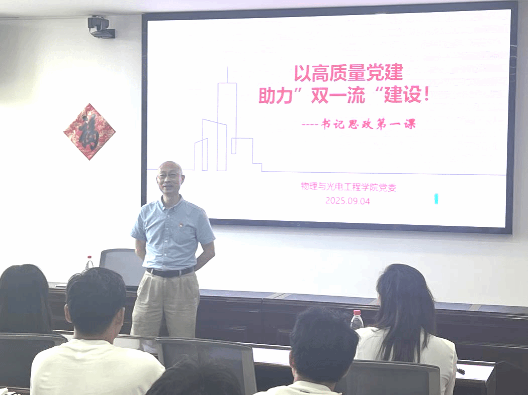 9月4日下午,物理与光电工程学院党委书记林兵在深圳大学粤海校区致原楼1101,开讲主题为《以高质量党建助力“双一流”建设》的“思政第一课”。本次课程有各学生支部书记、研究生新生党员共61人参加。课程由学院党委副书记林娜主持。